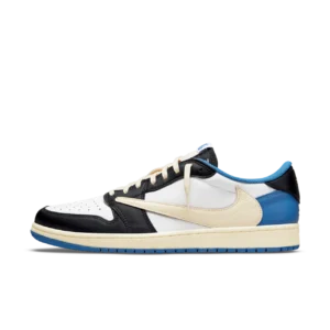 The Air Jordan 1 Low Travis Scott x Fragment is a premium, highly sought-after sneaker that combines iconic design elements from both Travis Scott and Fragment Design. It features a sleek leather and suede upper in a black, white, and blue colorway, with the signature reversed Swoosh from Travis Scott and the distinct Fragment branding on the heel and tongue. The low-top silhouette is completed with a cushioned midsole for comfort and a durable rubber outsole for traction. This collaboration is a must-have for sneaker enthusiasts in Rwanda, offering a perfect blend of exclusivity, style, and luxury.